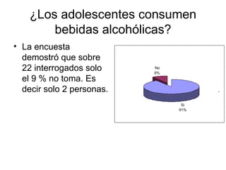 La encuesta encontró que el 91% de los adolescentes encuestados consume bebidas alcohólicas, con solo el 9% que no consume. El 39% de los adolescentes dijo que consume alcohol por sus efectos, aunque se esperaba un porcentaje más alto debido a la influencia del grupo. La compra de alcohol es fácil de acceder para los adolescentes. La mayoría compra bebidas alcohólicas en supermercados, almacenes y kioscos. La cerveza es la bebida alcohólica más consumida por los adolescentes, aunque también preoc