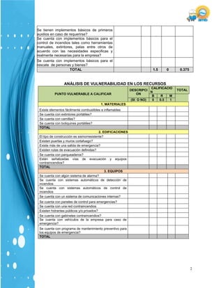 El documento analiza la vulnerabilidad en personas, recursos, sistemas y procesos ante emergencias en una empresa. En cuanto a las personas, se evalúa la organización, capacitación y dotación para emergencias, encontrando falencias en políticas, comités y entrenamiento. Respecto a los recursos, se identifican riesgos en materiales, edificaciones y equipos como la falta de extintores, rutas de evacuación y mantenimiento. En los sistemas y procesos se detectan deficiencias en servicios públicos, sistemas de respaldo y