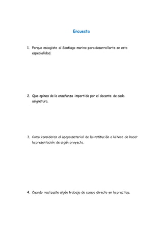 El documento presenta los resultados de una encuesta realizada a la comunidad estudiantil del Instituto Universitario Politécnico Santiago Mariño. Los datos positivos incluyen que algunos profesores incentivan el progreso de los estudiantes y que los directores responden a las quejas. Sin embargo, los datos negativos son que falta material de apoyo para los profesores, muchos no cumplen con destrezas de enseñanza y no hay suficiente seguridad. El análisis muestra que el 60% de los estudiantes no están satisfechos con la enseñanza