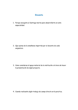 El documento presenta los resultados de una encuesta realizada a la comunidad estudiantil del Instituto Universitario Politécnico Santiago Mariño. Los datos positivos incluyen que algunos profesores incentivan el progreso de los estudiantes y que los directores responden a las quejas. Sin embargo, los datos negativos son que falta material de apoyo para los profesores, muchos no cumplen con destrezas de enseñanza y no hay suficiente seguridad. El análisis muestra que el 60% de los estudiantes no están satisfechos con la enseñanza