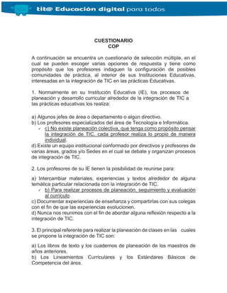 Este cuestionario de selección múltiple busca indagar sobre la configuración de posibles comunidades de práctica en torno a la integración de TIC en instituciones educativas. Según el cuestionario, en la mayoría de las instituciones no existe planeación colectiva sobre TIC, los profesores trabajan de manera individual y se reúnen principalmente para temas curriculares. También señala que los profesores suelen reunirse de manera esporádica para diseñar tareas colaborativamente y consideran que los dis