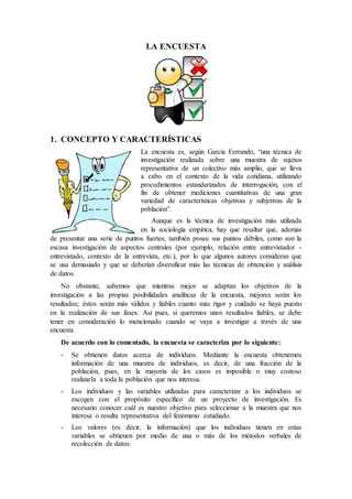 Este documento describe el concepto y características de las encuestas, los temas y áreas de estudio que se pueden abordar mediante encuestas, y los tipos de preguntas que se pueden incluir en una encuesta. Las encuestas se caracterizan por obtener datos de una muestra representativa de individuos a través de entrevistas o cuestionarios. Los temas que se pueden estudiar incluyen cultura, política, economía y problemas sociales. Existen preguntas de hechos, opiniones y conocimiento, y preguntas pueden ser abiertas o