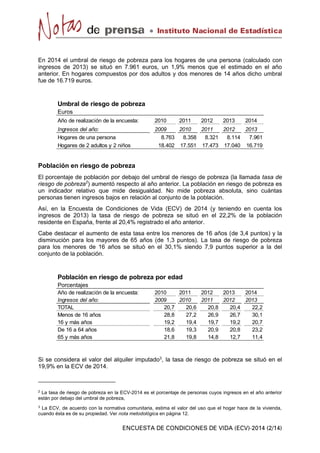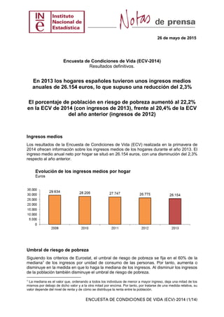 El documento resume los resultados de la Encuesta de Condiciones de Vida de 2014 sobre la situación económica de los hogares españoles. Los principales hallazgos son: 1) Los ingresos medios anuales de los hogares disminuyeron un 2,3% a 26.154 euros; 2) El porcentaje de población en riesgo de pobreza aumentó al 22,2% desde el 20,4% del año anterior; 3) Regiones como Andalucía, Murcia y Galicia tuvieron mayores tasas de hogares con dificultades para llegar a fin
