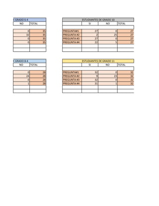 Este documento presenta los resultados de una encuesta realizada a estudiantes de diferentes grados sobre 4 preguntas. Se muestran los resultados por pregunta y grado de los estudiantes de grado 6, 8 y 10/11 que respondieron correctamente o incorrectamente, así como el total de estudiantes por grado y pregunta. Al final, se presenta el recuento total de las respuestas correctas e incorrectas de todos los estudiantes encuestados.