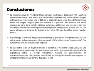 La imagen del presidente Mauricio Macri ha caído por debajo del 40%, con un 62% de la población evaluando negativamente su gestión. Por otro lado, Cristina Fernández de Kirchner mantiene una imagen positiva cercana al 40% y lidera en intención de voto en un hipotético balotaje contra Macri, aunque hay un 20% de indecisos. La expectativa económica es pesimista, con solo un 21% creyendo en una mejora inminente y un 61% anticipando un aumento de la inflación.