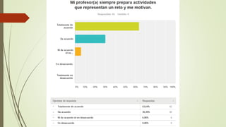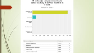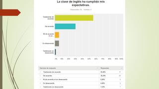 El resumen presenta los resultados de una encuesta de servicio realizada a estudiantes de inglés. Los estudiantes expresaron opiniones positivas sobre las clases, profesores y dinámicas. Algunos sugirieron tener acceso a la plataforma de aprendizaje en más días a la semana. Algunos comentaron problemas técnicos con los micrófonos durante las evaluaciones orales. El coordinador respondió que trabajarán en mejorar la plataforma y resolver problemas técnicos.