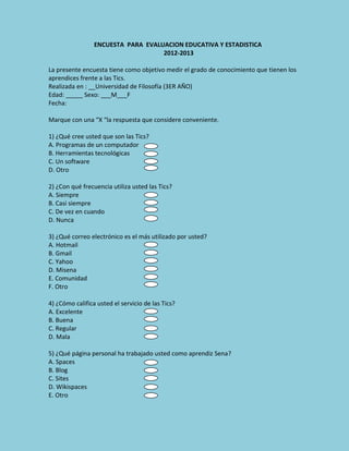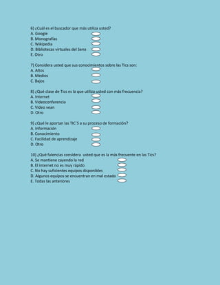 El documento presenta los resultados de una encuesta realizada a estudiantes universitarios sobre su uso y percepción de las tecnologías de la información y la comunicación (TIC). La mayoría de los estudiantes indicó que usan las TIC con frecuencia, y que les proveen información y facilidad de aprendizaje. Sin embargo, también reportaron falencias como la lentitud de Internet y la falta de equipos disponibles.