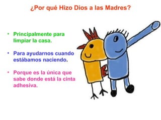 Principalmente para limpiar la casa. Para ayudarnos cuando estábamos naciendo . Porque es la única que sabe donde está la cinta adhesiva. ¿Por qué Hizo Dios a las Madres?