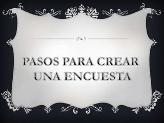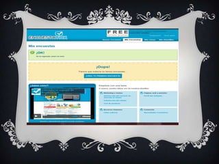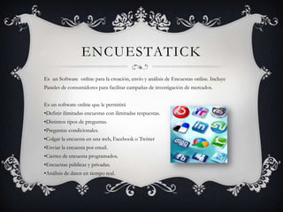 Este documento presenta información sobre una herramienta de software llamada Encuestatick que permite crear, distribuir y analizar encuestas en línea. Ofrece varias ventajas como envío rápido de encuestas por correo electrónico, reducción de costos, anonimato y resultados inmediatos. Sin embargo, también tiene algunas desventajas como excluir a segmentos sin acceso a la tecnología e incertidumbre sobre la identidad de los encuestados. El documento incluye instrucciones paso a paso sobre cómo crear una encuesta y ver los