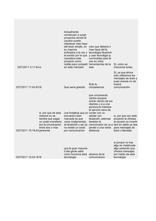 Este documento recopila opiniones de varias personas sobre un posible proyecto que permitiría enviar mensajes de voz a través de Bluetooth en lugar de mensajes de texto. Algunos ven fortalezas como la gratuidad y creatividad, mientras que debilidades incluyen la compatibilidad de dispositivos y el corto alcance de Bluetooth. La mayoría considera la idea innovadora por permitir nuevas formas de comunicación sin escribir mensajes.