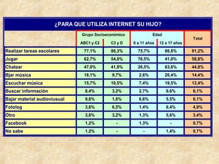 Una encuesta realizada entre el 12 y 14 de junio de 2008 en el Gran Santiago evaluó el uso de Internet entre residentes con hijos de 6 a 17 años que tengan acceso a Internet en el hogar y teléfono fijo. La encuesta incluyó 280 unidades y tuvo un margen de error de 5.9% con un nivel de confianza del 95%. Los hogares participantes fueron seleccionados al azar.