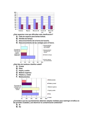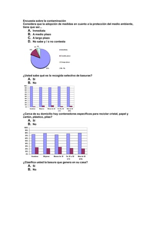 El documento presenta los resultados de una encuesta sobre la contaminación ambiental y las actitudes de las personas hacia ella. La mayoría de los encuestados reconocen la importancia de medidas inmediatas para proteger el medio ambiente, clasifican su basura y apoyan restricciones al tráfico para reducir la contaminación. Sin embargo, algunos están menos dispuestos a renunciar al uso de sus vehículos. En general, hay conciencia de los problemas ambientales pero aun falta compromiso para cambiar conductas contaminantes.