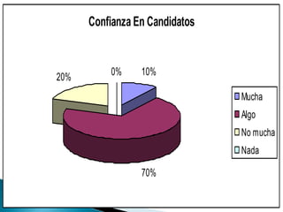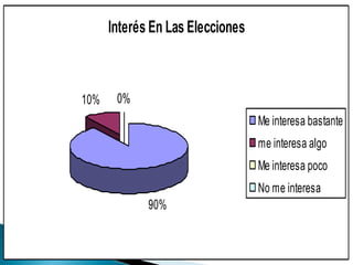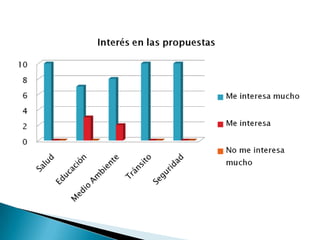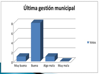Este documento presenta los resultados de una encuesta realizada por Infovoto en 2010 sobre las elecciones municipales en La Molina. La encuesta contiene 10 preguntas dirigidas a los residentes sobre sus intereses y opiniones con respecto a las propuestas y candidatos electorales, así como sobre problemas importantes y la gestión municipal anterior.