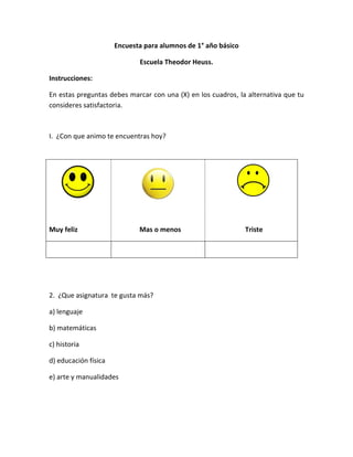 El documento presenta encuestas dirigidas a docentes, alumnos y apoderados sobre temas relacionados a la convivencia escolar. Los docentes responden preguntas sobre la aplicación del reglamento escolar, la intervención ante conflictos y el fomento de valores. Los alumnos responden preguntas sobre asignaturas favoritas, actividades extraescolares, aplicación de normas y situaciones de conflicto. Los apoderados responden preguntas sobre su conocimiento del reglamento escolar, la comunicación con docentes, apoyo a deberes y participación en activ