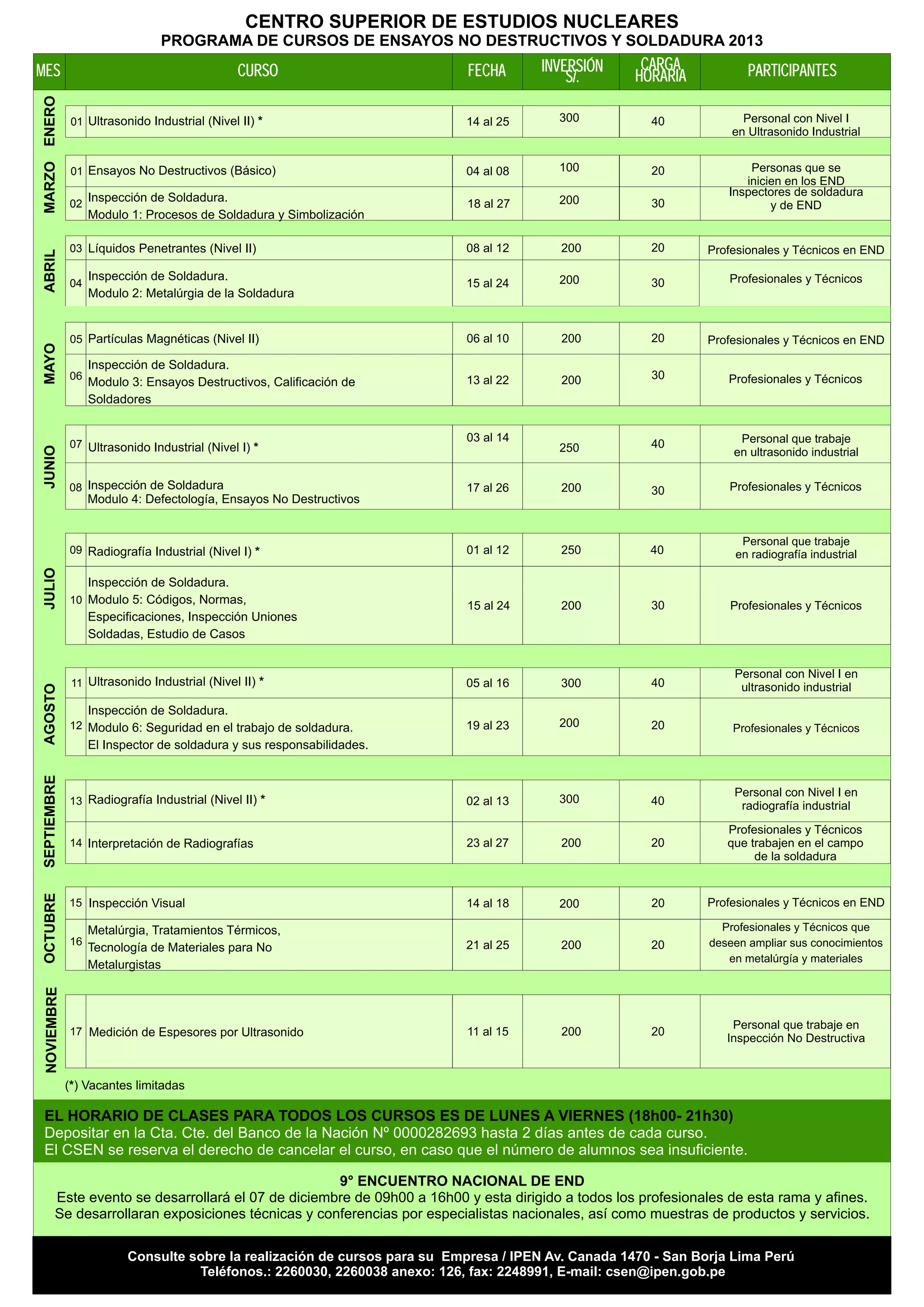 El Centro Superior de Estudios Nucleares ofrece varios cursos de ensayos no destructivos y soldadura durante el 2013, incluyendo cursos de ultrasonido industrial, inspección de soldadura, líquidos penetrantes, partículas magnéticas, radiografía industrial e inspección visual. También organizará el 9o Encuentro Nacional de Ensayos No Destructivos el 7 de diciembre para profesionales del sector.