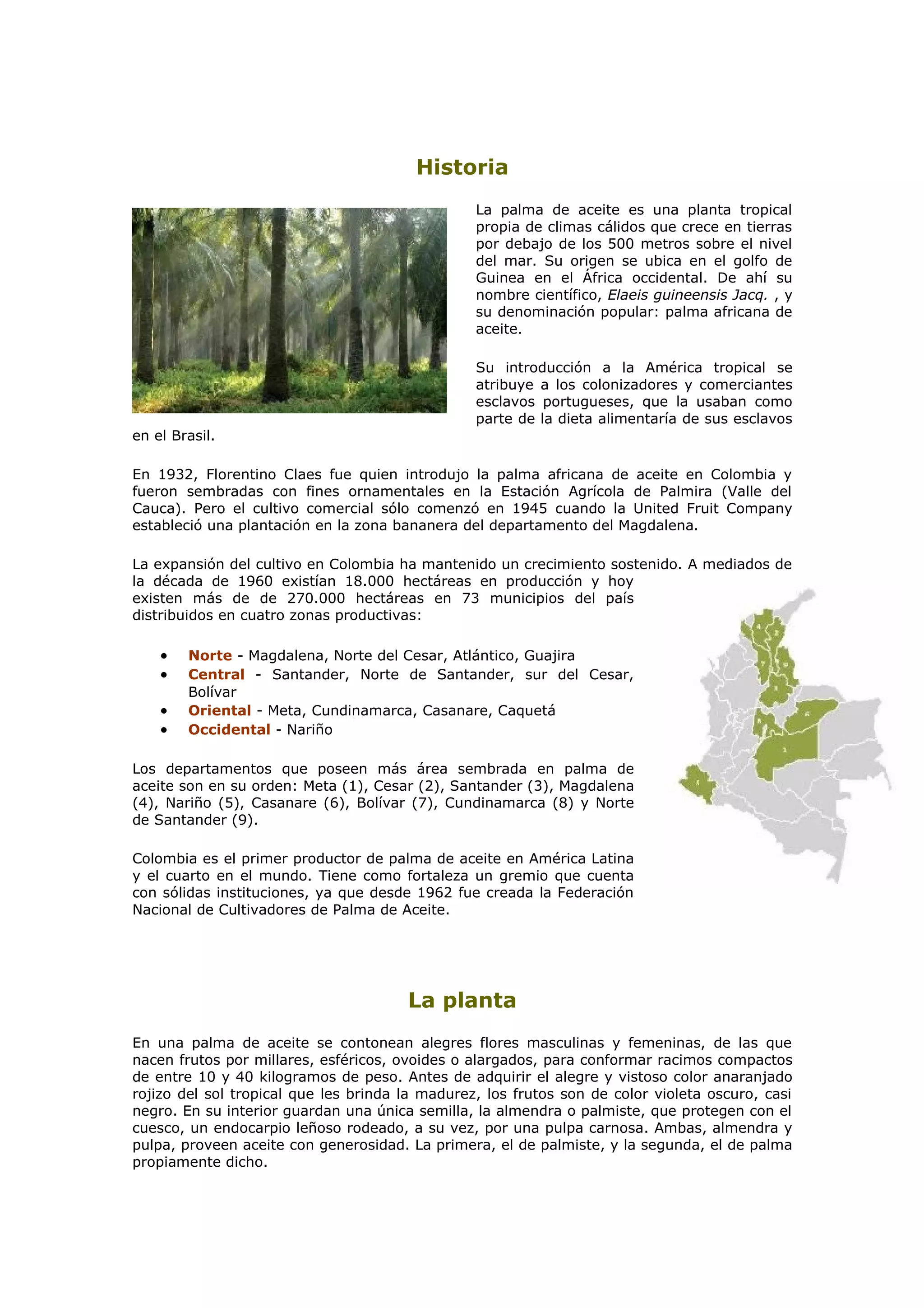 La palma de aceite tiene su origen en África occidental y fue introducida en América por los portugueses. En Colombia, su cultivo comenzó en 1945 y desde entonces ha tenido un crecimiento sostenido, convirtiéndose en el principal productor de palma de aceite en América Latina. El aceite de palma tiene múltiples usos industriales y alimenticios y estudios indican que su consumo puede tener beneficios para la salud humana.