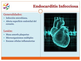 La endocarditis infecciosa es una infección bacteriana que afecta la superficie endotelial del corazón. Puede clasificarse según su curso clínico (aguda o subaguda), el huésped (válvula nativa, protésica, o en consumidores de drogas) y el microorganismo causante. Los síntomas incluyen fiebre, escalofríos y dolor. El tratamiento consiste generalmente en antibióticos como penicilina G, ceftriazona y gentamicina por varias semanas.