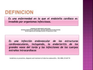 Este documento trata sobre la endocarditis infecciosa. En 1 oración resume que es una infección del endotelio cardíaco causada por organismos infecciosos. Luego describe brevemente los tipos principales de endocarditis, los factores de riesgo, manifestaciones clínicas, microbiología, criterios de diagnóstico y lineamientos de tratamiento.