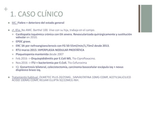 Este documento presenta el caso clínico de un hombre de 85 años que ingresó con fiebre, deterioro del estado general y diarrea. Tras varias pruebas, se diagnosticó con sepsis severa probablemente de origen urinario y daño renal agudo. Más tarde se sospechó de endocarditis infecciosa. El documento también resume información sobre la epidemiología, diagnóstico, criterios diagnósticos y pronóstico de la endocarditis infecciosa.