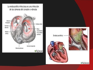 La endocarditis infecciosa es una infección del revestimiento de las cámaras y válvulas del corazón causada por bacterias u hongos. Los síntomas incluyen fiebre, escalofríos y dolor en el pecho. El diagnóstico se basa en hemocultivos positivos, ecocardiogramas y criterios clínicos. El tratamiento consiste en antibióticos intravenosos durante varias semanas e incluye cirugía en algunos casos para reparar o reemplazar las válvulas dañadas.