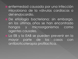 La endocarditis infecciosa es una infección de las válvulas cardiacas o el endocardio, generalmente causada por bacterias u hongos. Puede prevenirse en la mayoría de los casos mediante antibióticos de forma profiláctica antes de procedimientos dentales que causen bacteriemia. El diagnóstico se basa en signos clínicos, hemocultivos positivos y hallazgos ecocardiográficos, y el tratamiento consiste en antibióticos administrados por vía intravenosa durante semanas.