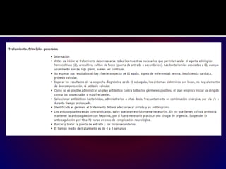 La endocarditis infecciosa es una infección del revestimiento interno del corazón que puede ser causada por bacterias o hongos. Los síntomas incluyen fiebre, dolor de pecho y ritmo cardíaco irregular. Si no se trata, puede causar daño a las válvulas cardíacas, insuficiencia cardíaca, embolias y abscesos cerebrales, con riesgo de muerte. El tratamiento consiste en antibióticos intravenosos por varias semanas para eliminar la infección y prevenir complicaciones.