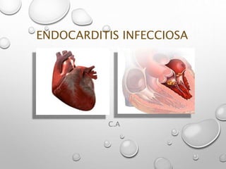 La endocarditis infecciosa es una infección del endocardio causada principalmente por bacterias y definida por la presencia de vegetaciones. Los estafilococos y estreptococos son los patógenos más comunes. Los síntomas incluyen fiebre, dolor articular y manifestaciones cardíacas como soplos. El diagnóstico se basa en los criterios de Duke modificados y en ecocardiogramas. El tratamiento consiste en antibióticos intravenosos prolongados y cirugía para casos complicados o refractarios.
