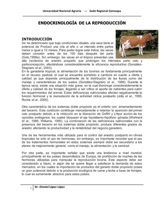 El documento trata sobre la endocrinología reproductiva de las vacas. Explica que las hormonas del eje hipotálamo-hipófisis-gonadal regulan el ciclo reproductivo de las vacas, incluyendo la GnRH, FSH, LH, estrógenos y progesterona. También discute cómo factores como la nutrición y el amamantamiento pueden afectar negativamente la reproducción al alterar los niveles hormonales.