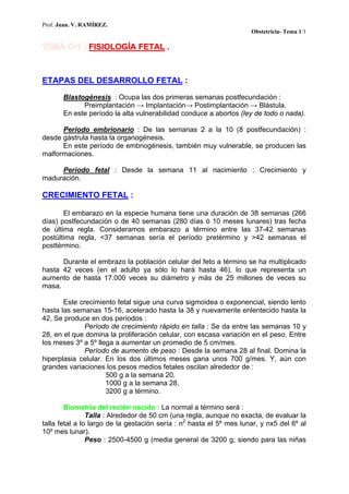 Este documento describe las etapas del desarrollo fetal, incluyendo el período de blastogénesis, el período embrionario y el período fetal. También describe el crecimiento fetal, factores que influyen en el crecimiento, el sistema cardiocirculatorio fetal, la hematología fetal y la maduración pulmonar.