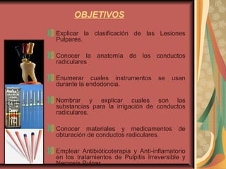 Este documento explica los conceptos y procedimientos básicos de la endodoncia. Resume la clasificación de las lesiones pulpares, la anatomía de los conductos radiculares, y los pasos para realizar la apertura de conductos. Explica las indicaciones y objetivos de la endodoncia, e identifica los instrumentos y materiales utilizados durante el tratamiento. Concluye con un mensaje positivo sobre la importancia de la salud dental.