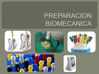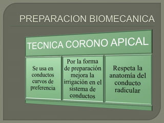 Este documento describe los procedimientos de endodoncia, incluyendo la preparación biomecánica del conducto radicular, el uso de sustancias químicas auxiliares y la obtucación. Describe las técnicas de preparación como la convencional, la apico-coronal y la corono-apical, así como el uso de limas flexibles, hidróxido de calcio y conos de gutapercha para obturar el conducto una vez seco y libre de infección. El objetivo es limpiar y conformar quirúrgicamente el conducto para permitir