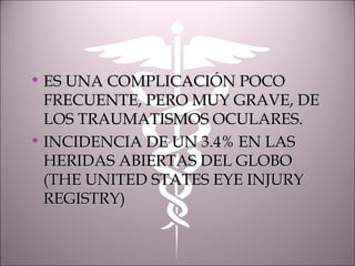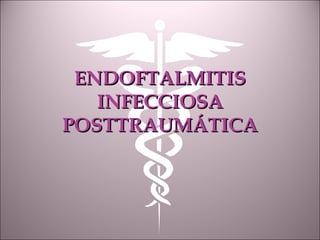 Este documento describe la endoftalmitis infecciosa postraumática. Explica que es una complicación rara pero grave de los traumatismos oculares, con una incidencia del 3.4% en heridas abiertas del globo ocular. Los factores que afectan su evolución incluyen el tipo de herida, microorganismo causal, presencia o ausencia de C.E.I.O. y tiempo hasta el tratamiento. También describe los diferentes tipos de endoftalmitis y factores de riesgo asociados a la endoftalmitis