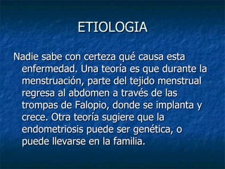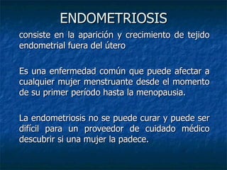 La endometriosis consiste en el crecimiento de tejido endometrial fuera del útero, puede afectar a cualquier mujer menstruante y no tiene cura. Los síntomas incluyen dolor pélvico severo durante la menstruación, relaciones sexuales e intestino, así como sangrado anormal e infertilidad. Se diagnostica mediante ecografía, resonancia magnética o laparoscopia. Los tratamientos son hormonales o quirúrgicos, dependiendo de la gravedad, y buscan controlar los síntomas aunque no curan la enfermedad