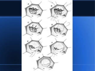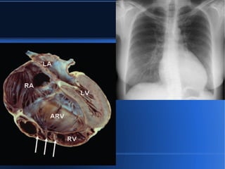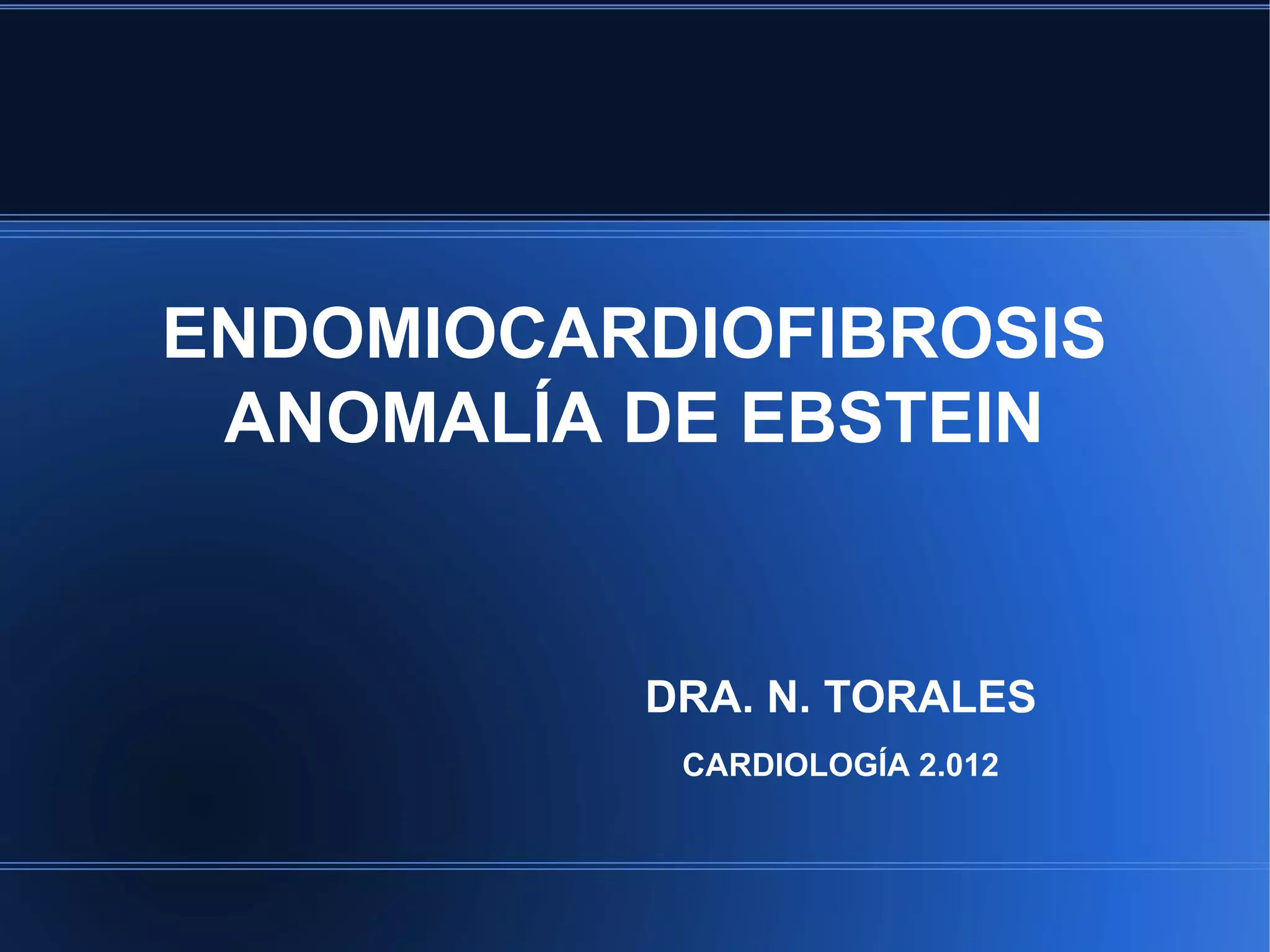Este documento describe dos anomalías cardíacas: la endomiocardiofibrosis y la anomalía de Ebstein. La endomiocardiofibrosis es una forma frecuente de miocardiopatía restrictiva que causa engrosamiento y fibrosis del endocardio. Puede presentarse en dos variantes. La anomalía de Ebstein implica un desplazamiento anómalo de la válvula tricúspide dentro del ventrículo derecho debido a una inserción anómala de los velos tricuspideos.