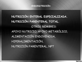 Este documento trata sobre la endonutrición, que incluye la nutrición enteral especializada y la nutrición parenteral total. Describe los objetivos, componentes, técnicas, requerimientos calóricos, complicaciones y antecedentes de la nutrición parenteral y enteral. También incluye información sobre la nutrición de prematuros, recién nacidos y niños.