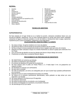 El documento presenta el plan de tratamiento para un paciente de 53 años llamado David O. Alvarado Mendoza. Se realizará un endoposte en el segundo molar inferior derecho del paciente, el cual previamente recibió un tratamiento de endodoncia. El procedimiento incluye la anestesia del área, aislamiento con dique de goma y grapas, preparación del conducto radicular, colocación y fijación del endoposte con resina compuesta y reconstrucción del diente.