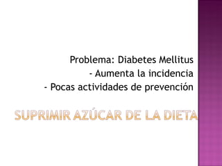 El documento habla sobre la diabetes y los edulcorantes artificiales. Explica que la diabetes está aumentando y que se necesitan más actividades de prevención. Luego describe diferentes edulcorantes como la sacarina, aspartamo y sucralosa, y explica que se realizarán análisis sensoriales y pruebas de tolerancia a la glucosa para determinar si serán aceptados por los consumidores y si aportan calorías. Finalmente, proporciona detalles sobre las pruebas que se llevarán a cabo.