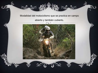 El enduro es una modalidad del motociclismo que consiste en carreras de rally en las que los pilotos deben completar recorridos establecidos en tiempos determinados a través de campos abiertos y cubiertos, requiriendo habilidad, destreza y velocidad en la motocicleta pese al riesgo inherente. Además de permitir la convivencia familiar, el enduro da acceso a paisajes inaccesibles de otra forma.
