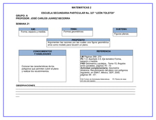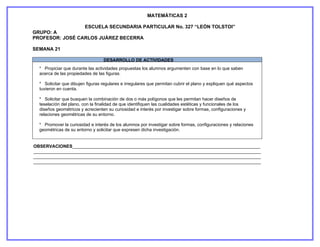 Este documento presenta el plan de estudios de Matemáticas 2 para la Semana 21 en la Escuela Secundaria Particular No. 327 “León Tolstoi”. El tema central es las figuras planas, con un enfoque en argumentar las razones por las cuales una figura geométrica sirve como modelo para recubrir un plano. El profesor José Carlos Juárez Becerra desarrollará actividades para que los estudiantes exploren las características de los polígonos que permiten cubrir un plano y creen diseños de teselación.