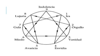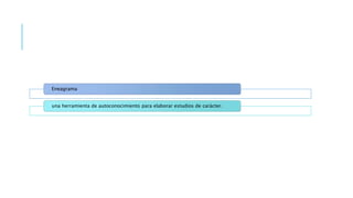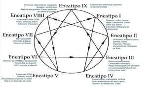 El documento presenta el eneagrama como una herramienta de autoconocimiento que ayuda a identificar y comprender los nueve tipos de personalidad, conocidos como eneatipos, y su impacto en las interacciones personales. Cada eneatipo refleja una pasión y comportamientos únicos que pueden ser mejorados para fomentar el crecimiento personal y mejorar las relaciones. Además, se describen características y posibles excesos de cada eneatipo, así como las influencias de alas y flechas en su desarrollo personal.