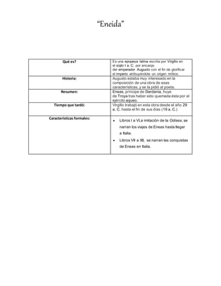 La Eneida es una epopeya latina escrita por Virgilio en el siglo I a.C. por encargo del emperador Augusto para glorificar el imperio romano. La historia sigue a Eneas, un príncipe troyano que huye de Troya después de que fuera quemada por los griegos, y sus viajes por mar hasta Italia donde lucha para establecerse. Virgilio trabajó en la obra desde el 29 a.C. hasta su muerte en el 19 a.C.