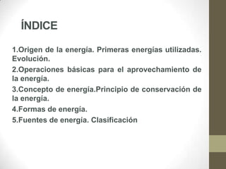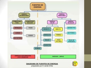 El documento describe las diferentes formas y fuentes de energía. Explica que las fuentes de energía se dividen en renovables y no renovables. Las fuentes renovables incluyen la energía solar, eólica, hidráulica y geotérmica, mientras que las no renovables incluyen los combustibles fósiles como el carbón, petróleo y gas natural, así como la energía nuclear. También describe brevemente las características y usos de diferentes formas de energía como la química, eléctrica y térmica.
