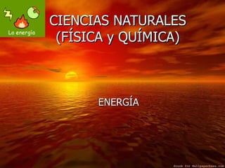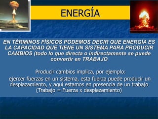 Este documento habla sobre la energía en términos físicos y químicos. Explica que la energía es la capacidad de un sistema para producir cambios y que puede residir en la velocidad, masa, posición o estructura interna de un sistema. También discute que la energía se conserva, se transforma, se transfiere, se genera, se degrada y se transporta. Finalmente, clasifica diferentes tipos de energía como cinética, potencial y radiante.