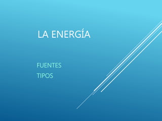 El documento habla sobre las diferentes fuentes y tipos de energía. Explica que existen fuentes renovables como la luz solar, el viento y la energía hidráulica, y no renovables como el petróleo, el carbón y el gas natural. Además, describe los diferentes tipos de energía como la cinética, potencial, solar, eólica, hidráulica, geotérmica, nuclear, química, eléctrica y electromagnética.
