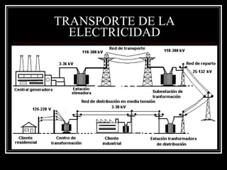 El documento describe diferentes tipos de centrales eléctricas y sus ventajas e inconvenientes medioambientales. Explica cómo se transforma la energía en electricidad en centrales térmicas convencionales, nucleares, de biomasa, eólicas, solares, geotérmicas e hidroeléctricas. También analiza los impactos ambientales de la extracción y transporte de combustibles, así como las posibles soluciones como el ahorro energético y el uso de fuentes renovables.