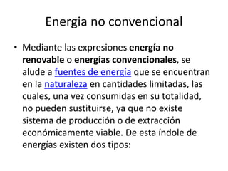 Las energías convencionales son fuentes tradicionales de energía como el petróleo y el gas natural que se agotan con el uso. A diferencia de las energías renovables, las energías convencionales no pueden reemplazarse una vez que se consumen completamente. El uso de energías convencionales puede tener un impacto significativo en el medio ambiente.