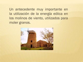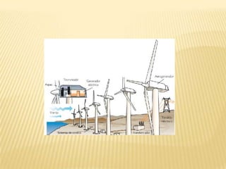 El documento habla sobre la energía eólica. Explica que la energía eólica proviene de la conversión de la energía cinética del viento en energía mecánica y eléctrica mediante aerogeneradores. También describe que los aerogeneradores están compuestos por un rotor con palas accionado por el viento y un generador movido por el rotor. Además, señala que la energía eólica es abundante pero variable, por lo que es más eficiente en zonas con vientos frecuentes.