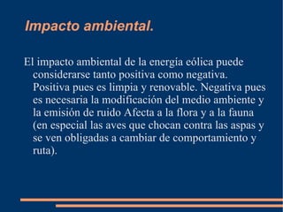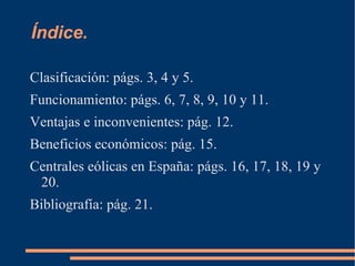Este documento describe la energía eólica, su funcionamiento, ventajas e inconvenientes y su uso en España. Explica que la energía eólica se obtiene de la energía cinética del viento y se transforma en energía eléctrica mediante aerogeneradores. Señala que tiene ventajas como ser renovable y no producir emisiones, pero también inconvenientes como requerir grandes territorios y afectar a la avifauna. Además, destaca los beneficios económicos que genera, como empleos, y comenta que en España se