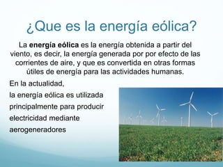 El documento proporciona información sobre la energía eólica. Explica que es la energía generada a partir del viento y que se usa principalmente para producir electricidad mediante aerogeneradores. Detalla algunas ventajas como que no contamina, es inagotable y ayuda a evitar el cambio climático, pero también desventajas como el tamaño y costo de las máquinas. Además, presenta datos sobre los principales países productores de energía eólica, como China, EE.UU. y Alemania, y lugares en México donde