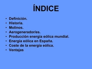 Este documento describe la energía eólica, incluyendo su definición, historia, tipos de aerogeneradores, producción mundial y ventajas. Explica que la energía eólica se obtiene del viento y se usó originalmente para navegar, moler grano y bombear agua. Ahora se usa principalmente para generar electricidad mediante aerogeneradores, que convierten la energía cinética del viento en energía eléctrica a través de aspas unidas a un generador. España es líder mundial en energía eólica